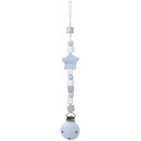 Speenkoordje van het merk BamBam! Het speenkoord is van wit. blauw en zilver hout en met clip om hem vast te maken.